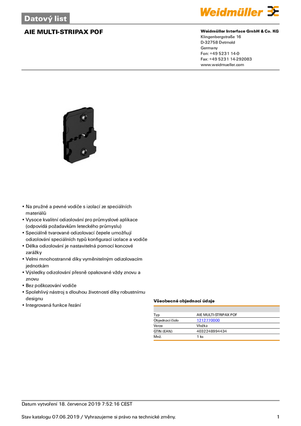 Weidmüller AIE MULTI-STRIPAX POF 1212770000 Wkładka do zaciskarki przewodniki i przewody POF Kompatybilność z markami We