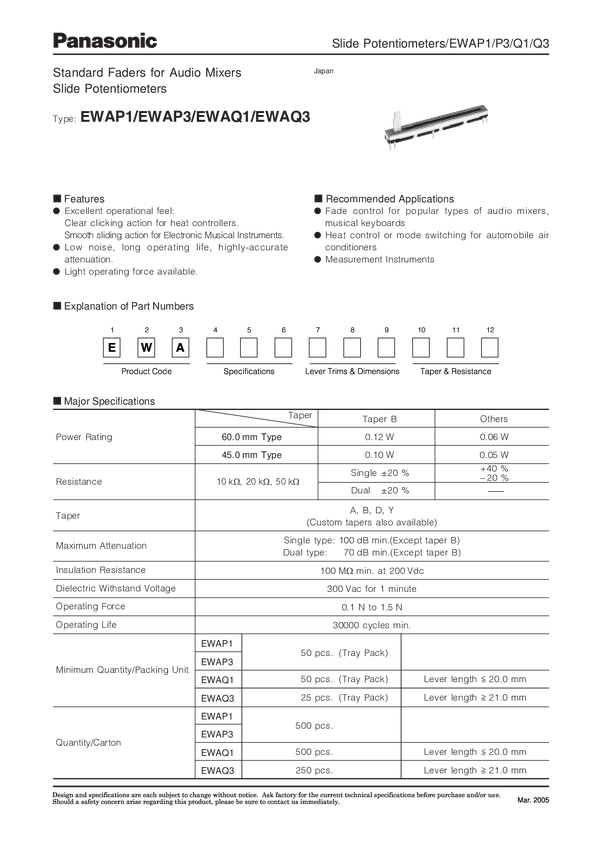 Potencjometr suwakowy pojedyńczy ( single) travel 30 mm moc 0,06W, wymiary: 45 mm x 8 mm x 7 mm; wodzik plastyk C15 długość 15mm, szer 5mm; rezystancja 110kohm, charakterystyka liniowa; Produkcja Panasonic (Matsushita)