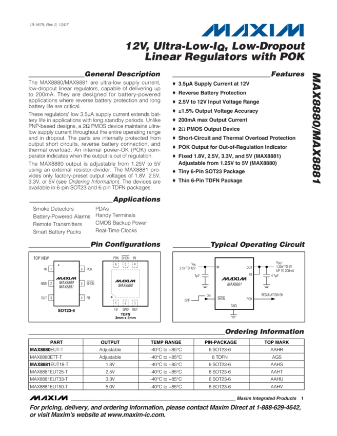 MAX8880, MAX8881 12V, Ultra-Low-IQ, Low-Dropout Linear Regulators with POK