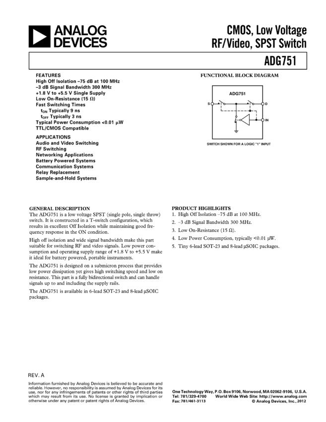 ADG751: CMOS, Low Voltage, RF/Video, SPST Switch (Single Pole, Single Throw)
