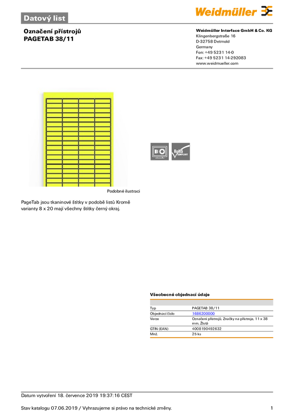 Weidmüller 1686200000 PAGETAB 38X11 Etykieta kablowa 38 x 11 mm Kolor pola etykiety: żółty Ilość etykiet: 2500