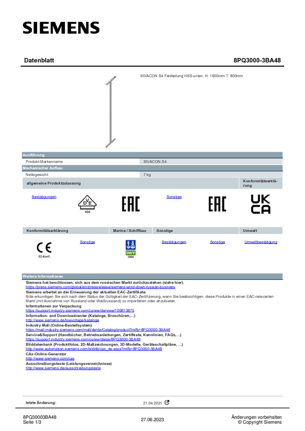 Podział na pola Siemens 8PQ3000-3BA48 1 szt.