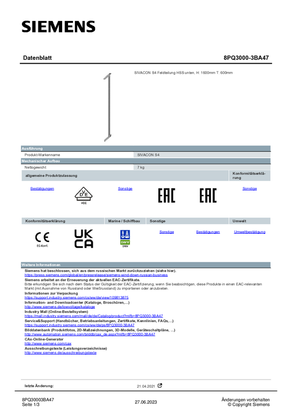 Podział na pola Siemens 8PQ3000-3BA47 1 szt.