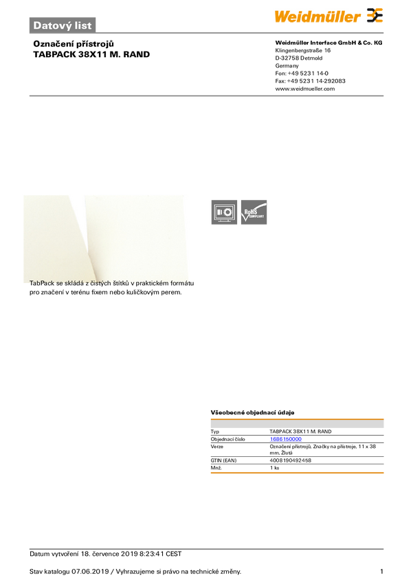 Weidmüller 1686130000 TABPACK 19X11 M. RAND Etykieta kablowa 19 x 11 mm Kolor pola etykiety: żółty Ilość etykiet: 440