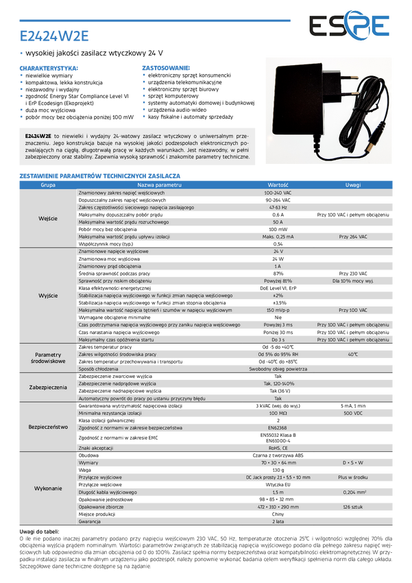 Zasilacz wtyczkowy ESPE 24V 1A 24W odwrócona polaryzacja | E2424W2E