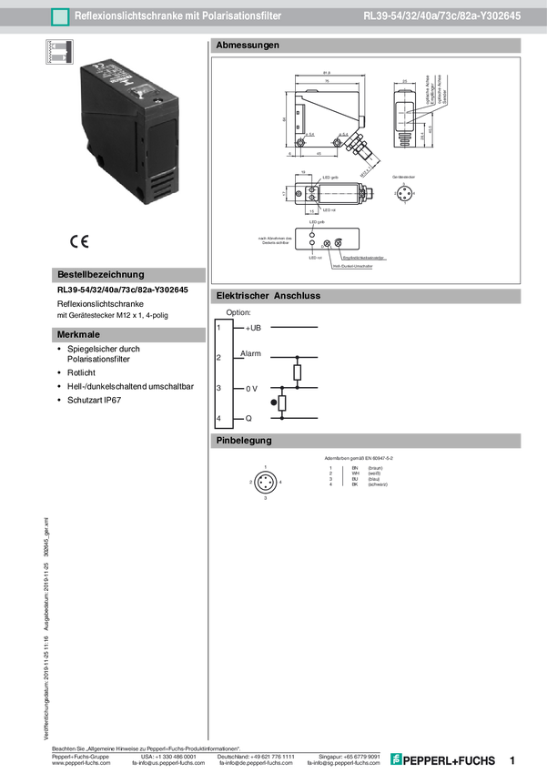 Fotokomórka odbiciowa Pepperl+Fuchs RL39-54/32/40a/73c/82a-Y302645 302645 Polaryzator, przełączanie w ciemności, przełą