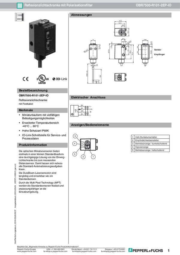 Fotokomórka odbiciowa Pepperl+Fuchs OBR7500-R100-2EP-IO-0,3M-V31 267075-100004 Polaryzator, Przełącznik (Jasność / Ciemn