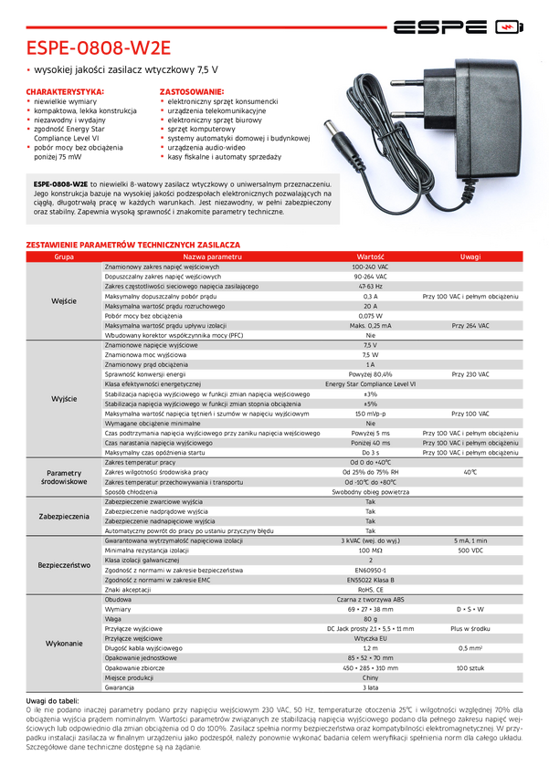 Zasilacz wtyczkowy ESPE 7,5V 1A 7,5W odwrócona polaryzacja | PRO0808W2E