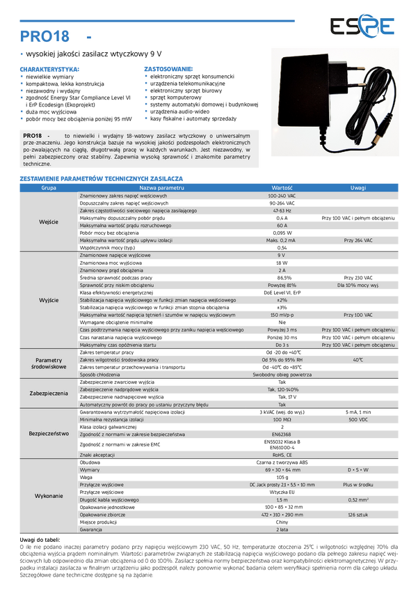 Zasilacz wtyczkowy ESPE 9V 2A 18W odwrócona polaryzacja | PRO1809W2E