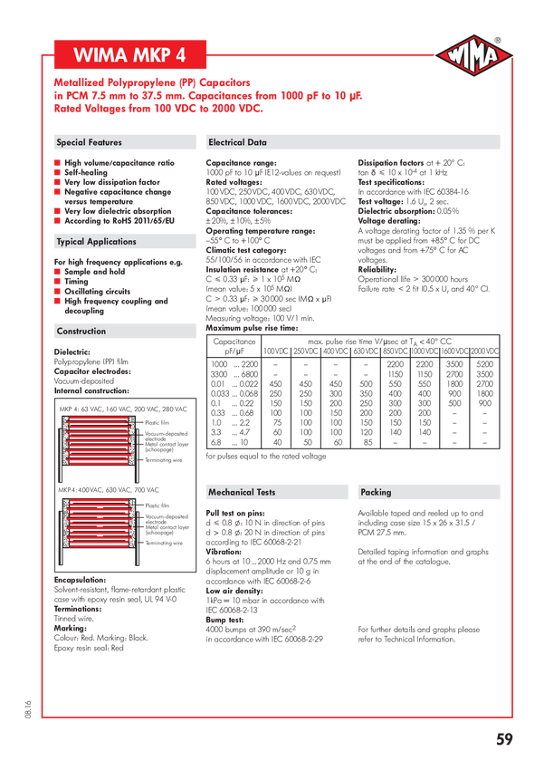Kondensator polipropylenowy Wima MKP 10, 0.33 uF, 1000 V/DC/600 V/AC, RM 27.5 mm, +10 %
