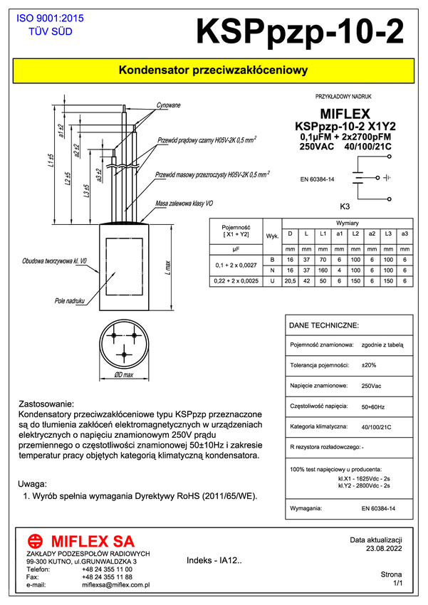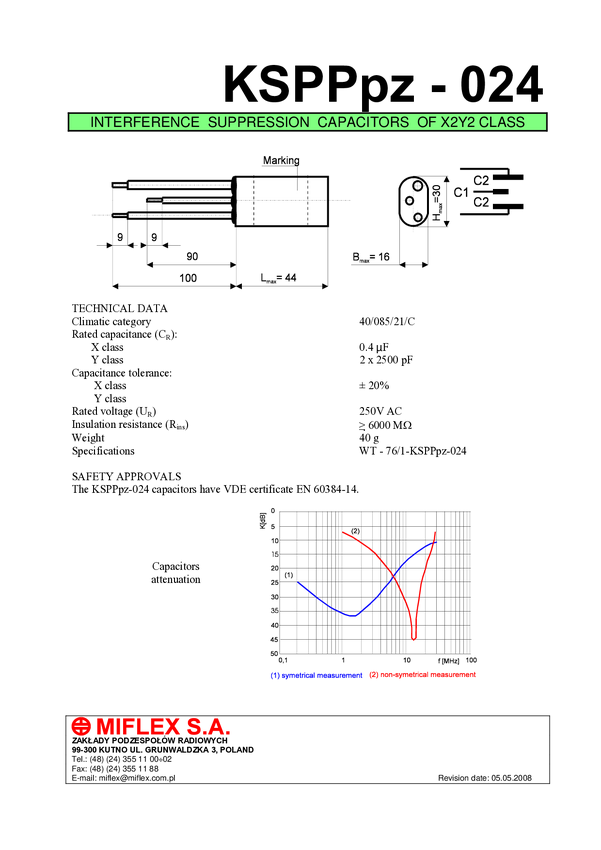 Kondensator; polipropylenowy; X2, Y2; 20%; Cx: 400nF; Cy: 2,5nF; 250V AC; 3 przewody; KSPPZP-24-400N; IA24DU444M250M; MIFLEX; op/100szt