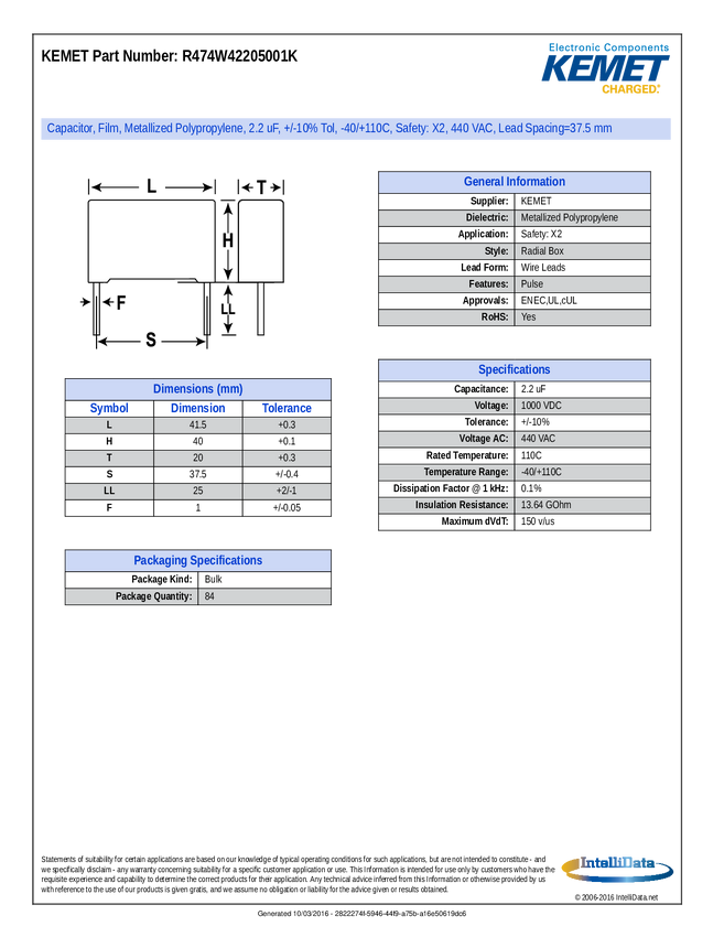 Kondensator; 2,2uF; 440V AC; polipropylenowy; 41,5x20x40mm; THT; 37,5mm; 10%; R474W42205001K; 2,2mF/440VAC; KEMET; RoHS