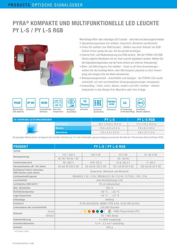 Sygnalizator świetlny Pfannenberg PY L-S 10-60 DC AM 7035 LED pomarańczowy Flesz, światło ciągłe, światło migające 24 V/