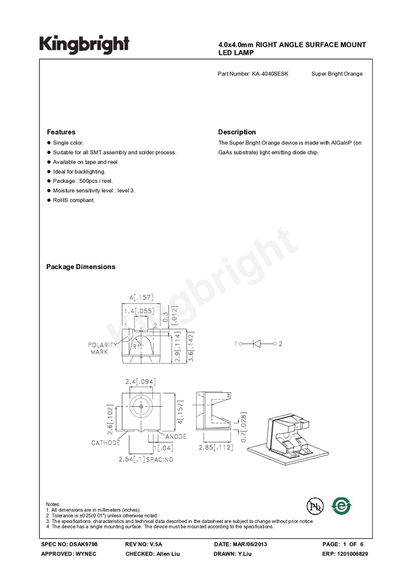 Dioda; LED; SMD; 4040; pomarańczowy; 2,1-2,5V; 200-450mcd; 120*; 4x3,6x4mm; SMD; KINGBRIGHT ELECTRONIC; KA-4040SESK; RoHS