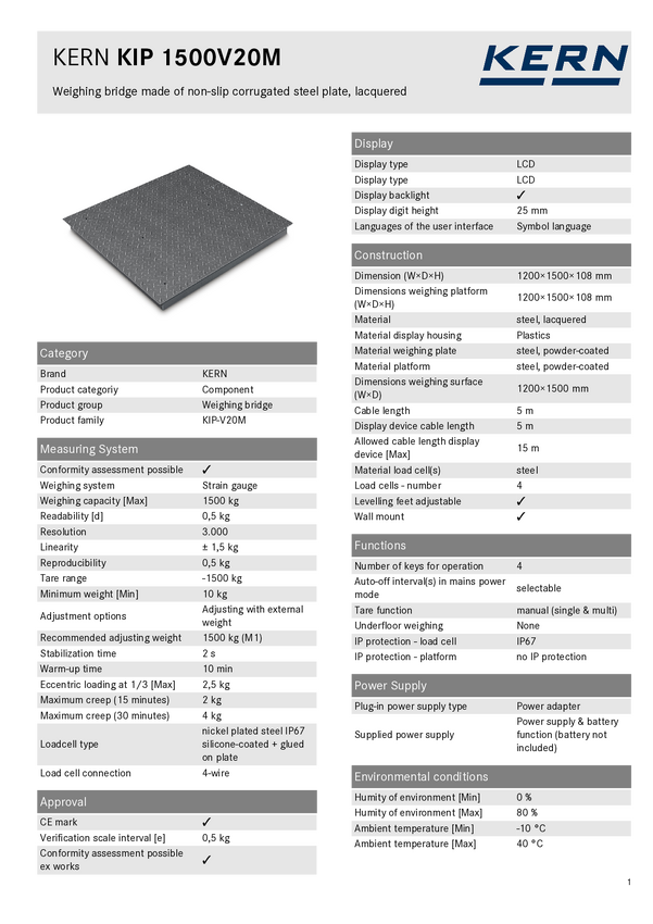 Pomost wagowy KIP 1500V20SM, zakres ważenia 1500 kg, dokładność odczytu 0,5 kg Kern KIP 1500V20SM