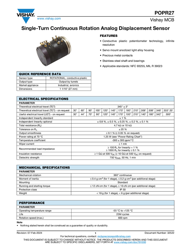 Single-Turn Continuous Rotation Analog Displacement Sensor