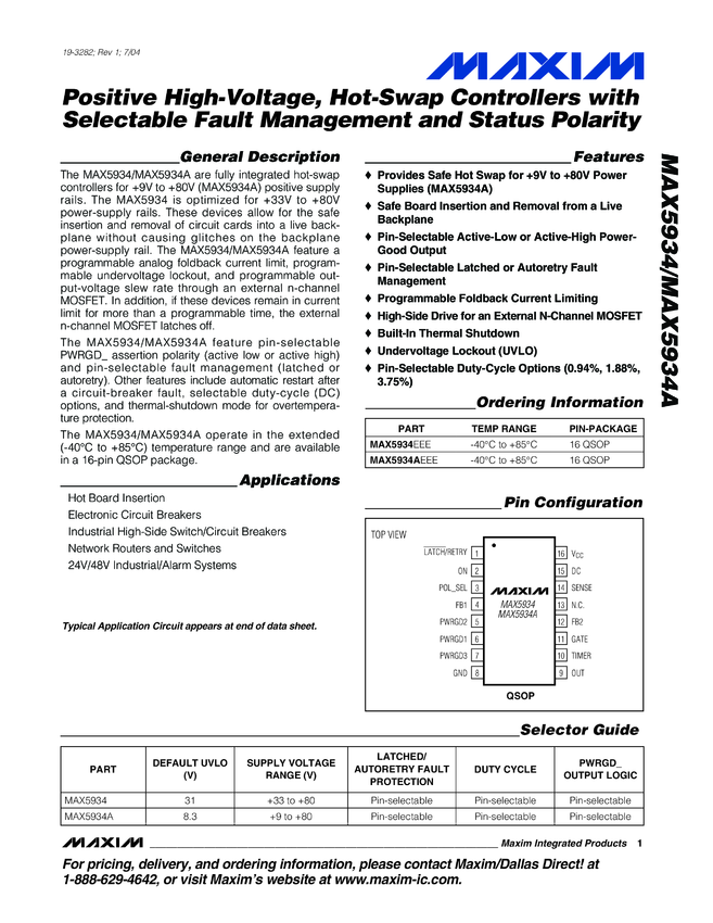 MAX5934, MAX5934A Positive High-Voltage, Hot-Swap Controllers with Selectable Fault Management and Status Polarity