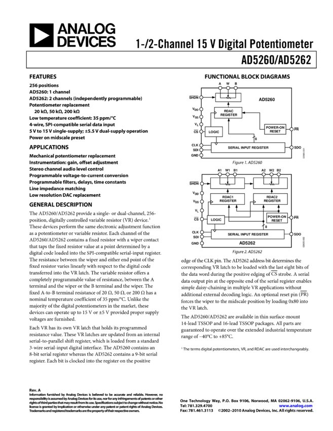 AD5262: +15 V or ±5 V, Dual-Channel, SPI Compatible, 256 Position Digital Potentiometer