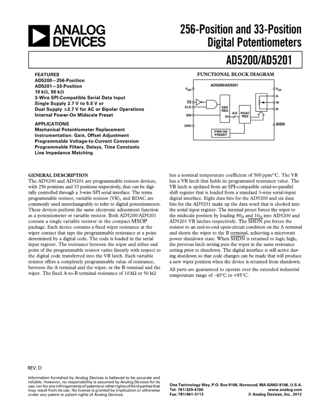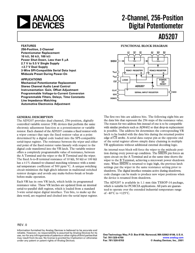 AD5207: Dual, 256 Position, Digital Potentiometer