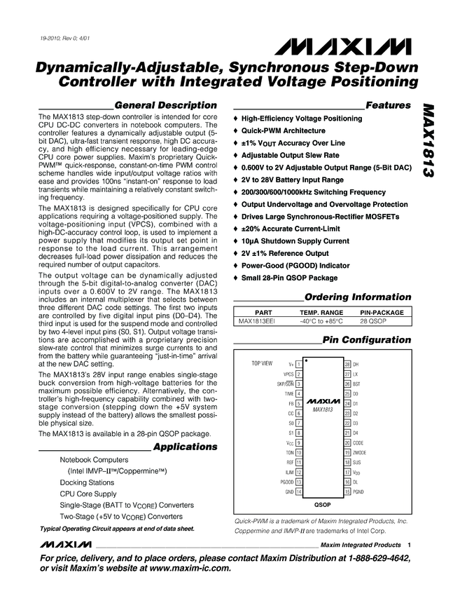 MAX1813 Dynamically-Adjustable, Synchronous Step-Down Controller with Integrated Voltage Positioning