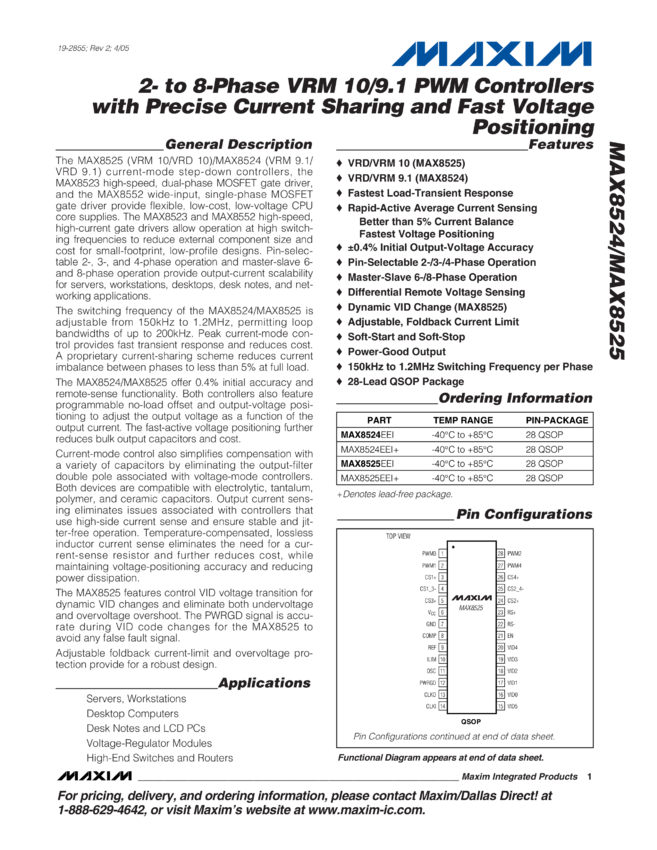 MAX8524, MAX8525 2- to 8-Phase VRM 10/9.1 PWM Controllers with Precise Current Sharing and Fast Voltage Positioning