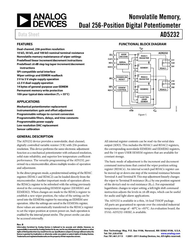AD5232: Nonvolatile Memory, Dual, 256-Position Digital Potentiometer