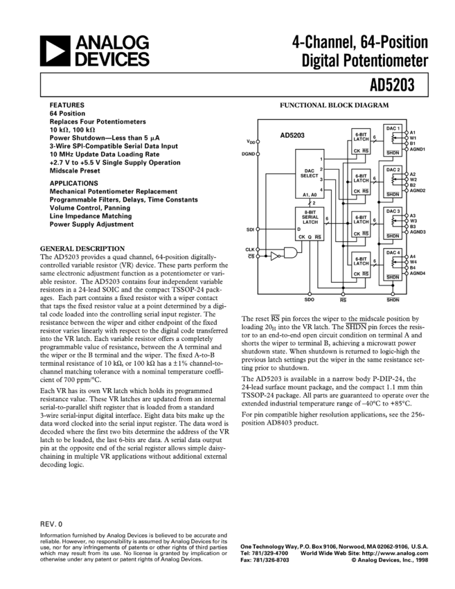 AD5203: 4-Channel, 64-Position Digital Potentiometer