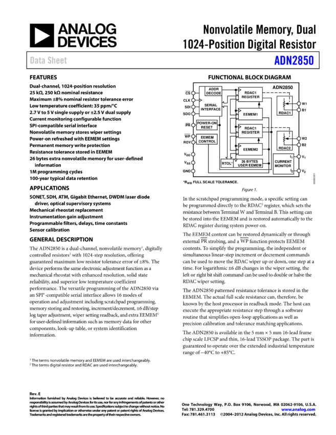 ADN2850: Nonvolatile Memory, Dual 1024-Position Digital Resistor