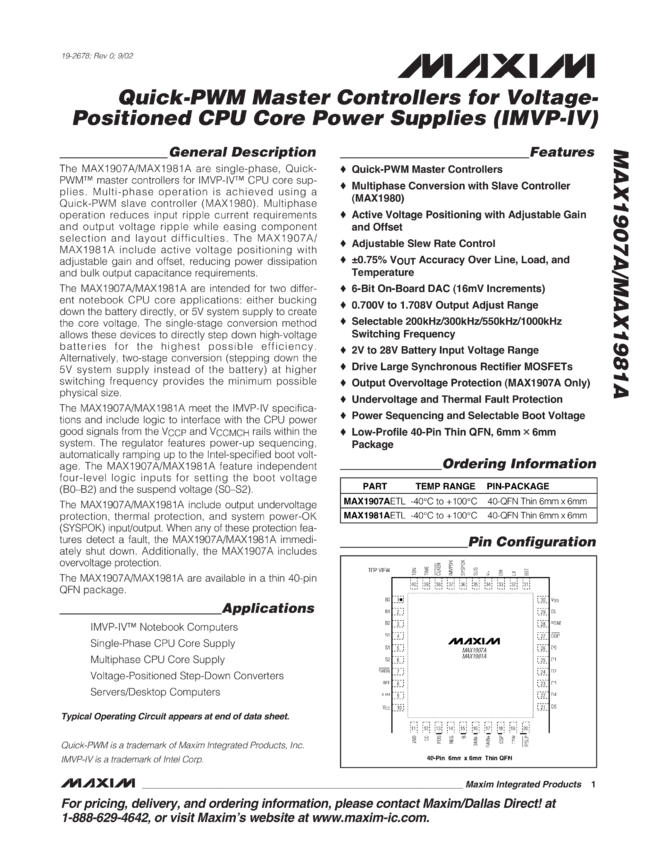 MAX1907A, MAX1981A Quick-PWM Master Controllers for Voltage-Positioned CPU Core Power Supplies (IMVP-IV)