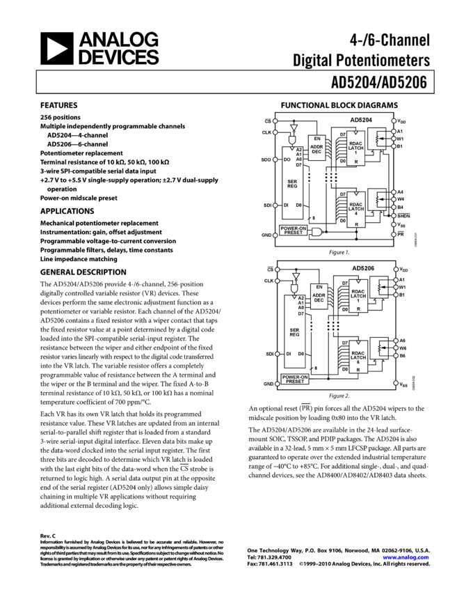 AD5206: 6-Channel, 256-Position Digital Potentiometer