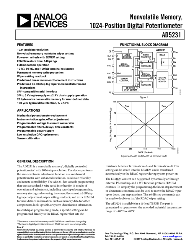 AD5231: Nonvolatile Memory, 1024-Position Digital Potentiometer