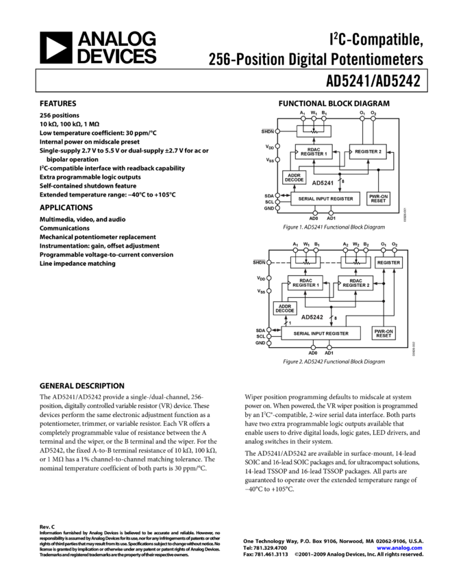 AD5242: Dual-Channel, IC® Compatible, 256 Position, Digital Potentiometer