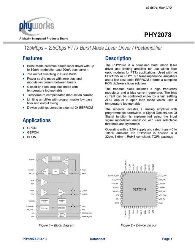 PHY2078 125Mbps to 2.5Gbps FTTx Burst-Mode Laser Driver/Postamplifier