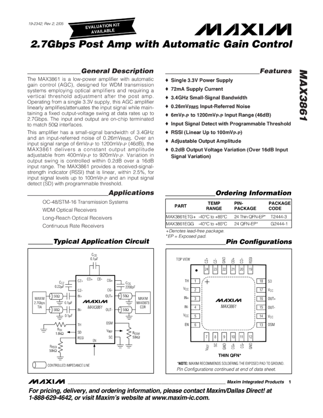 MAX3861 2.7Gbps Post Amp with Automatic Gain Control