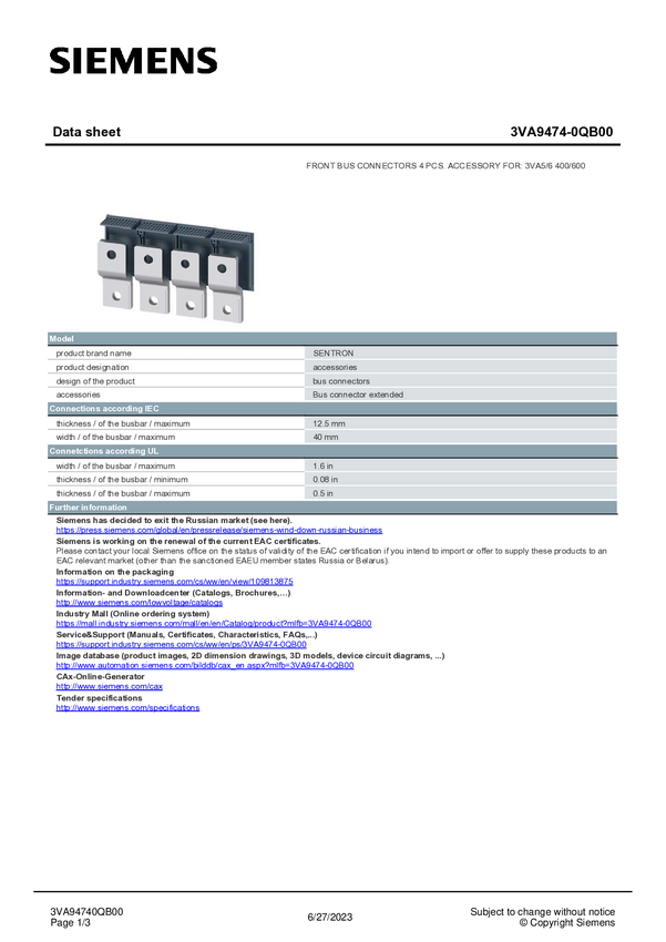 Poszerzenie połączeń Siemens 3VA9474-0QB00 1 szt.