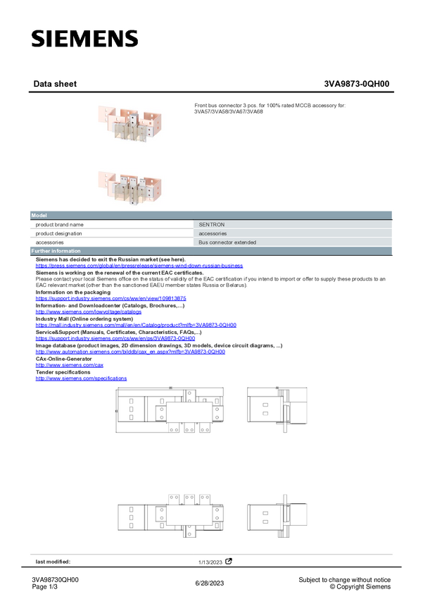 Poszerzenie połączeń Siemens 3VA9873-0QB00 1 szt.