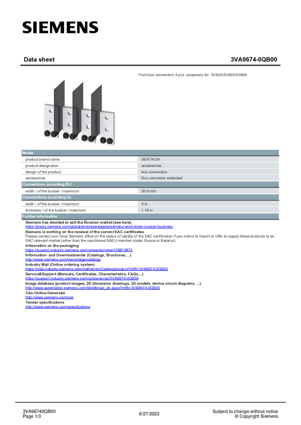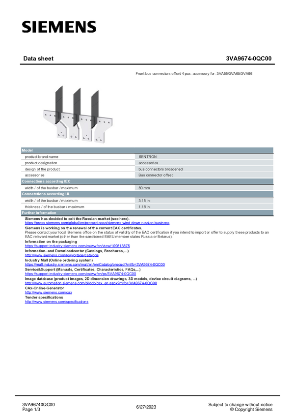 Poszerzenie połączeń Siemens 3VA9674-0QB00 1 szt.