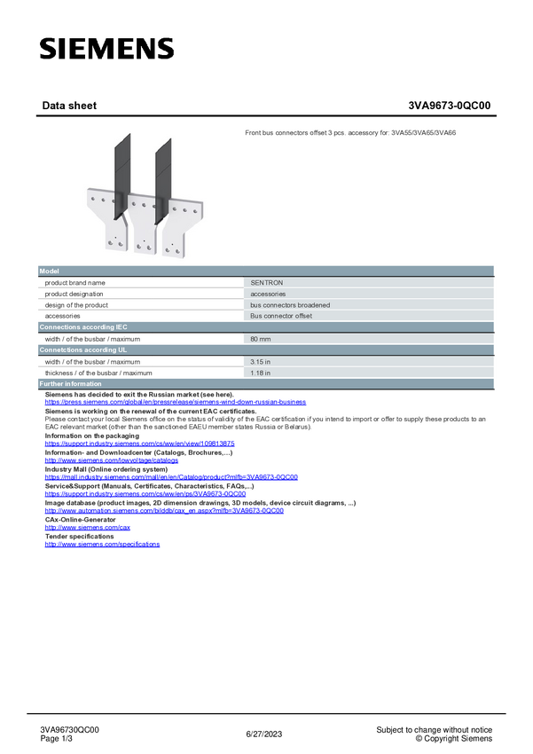Poszerzenie połączeń Siemens 3VA9673-0QB00 1 szt.
