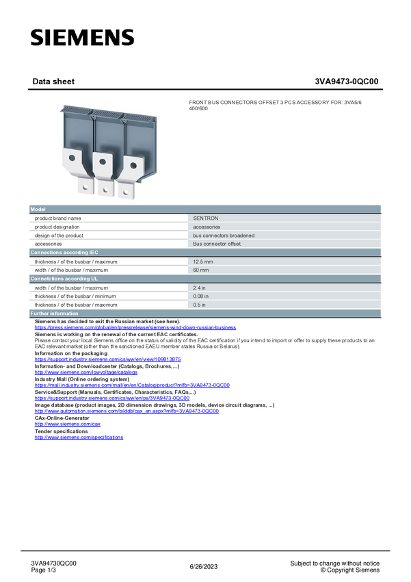 Poszerzenie połączeń Siemens 3VA9473-0QC00 1 szt.