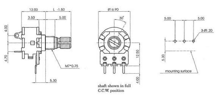 Potencjometr; osiowy; jednoobrotowy; 20kOhm; 0,125W; liniowa; 20%; oś 6mm; 15mm; z wyłącznikiem; THT; WH160AK-2-18T 15V B20K; RoHS