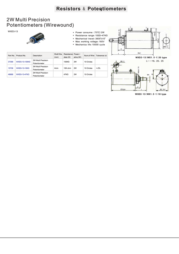 Potencjometr; osiowy; wieloobrotowy; WXD3-13-2W; 22K; 2W; liniowa; 5%; oś 4mm; 20mm; 10 obrotów; Bochen; RoHS