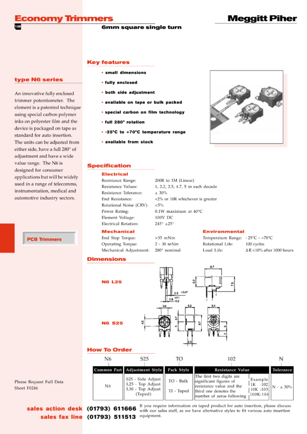 Potencjometr montażowy pionowy 220kΩ, N6S25TON224