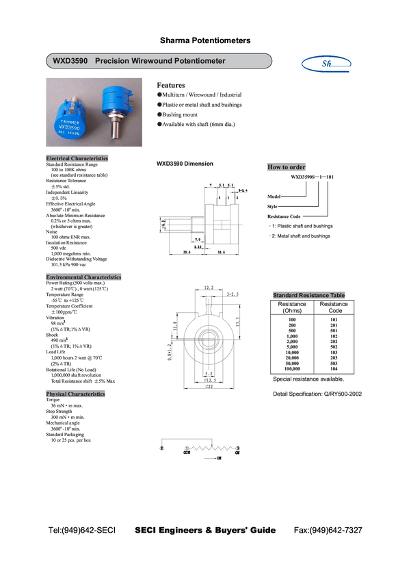 Potencjometr; osiowy; wieloobrotowy; WXD3590S-102; 1kOhm; liniowa; 5%; 2W; oś 6,35mm; 20,6mm; metal; RoHS