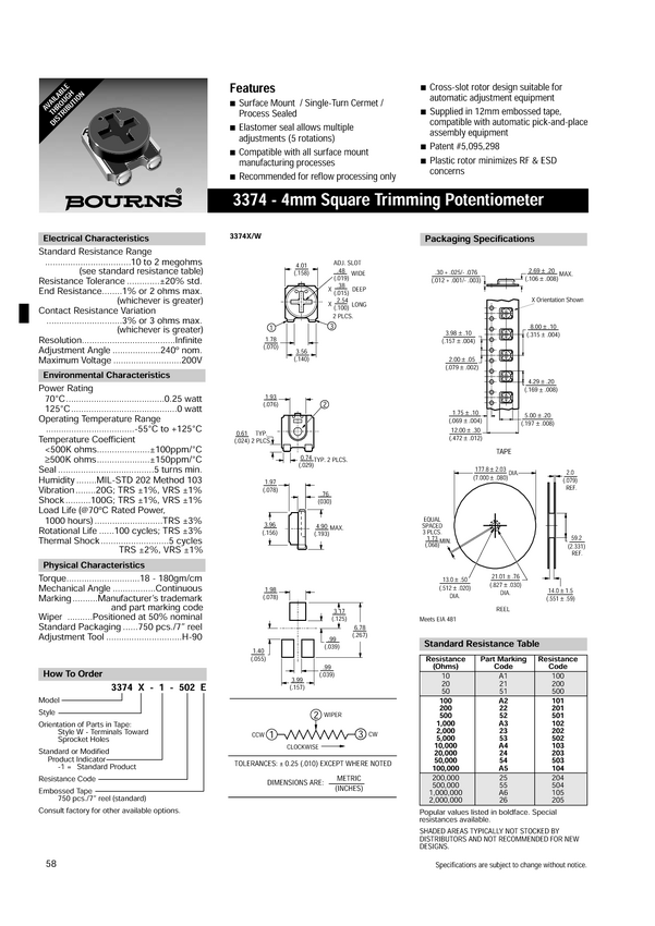 Potencjometr; montażowy; jednoobrotowy; 50K; 0,25W; leżący; SMD; 3374X001503E; BOURNS; RoHS