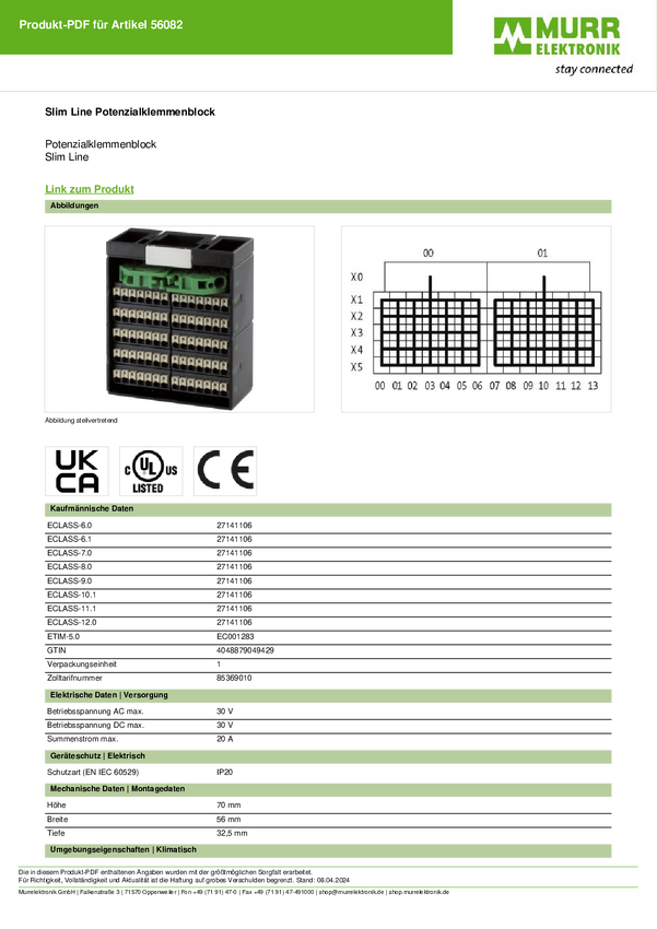 Listwa zaciskowa potencjału Murrelektronik 56082 56082, 1 szt.