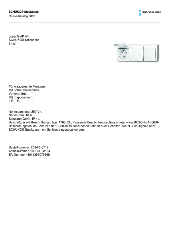 Busch-Jaeger 2300/3 EW-54 Osprzęt elektroinstalacyjny do pomieszczeń wilgotnych Gniazdo elektryczne potrójne Ocean, naty