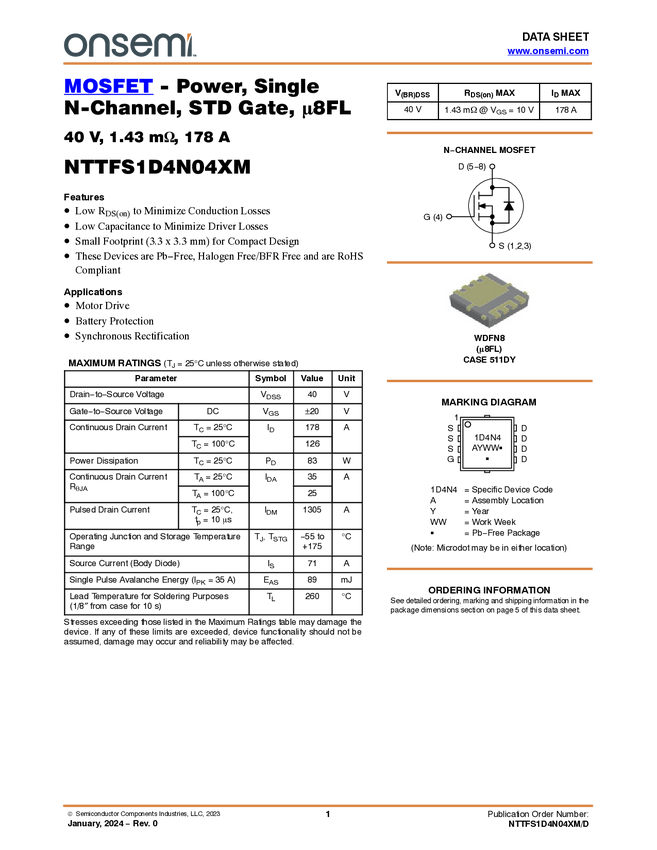 MOSFET - Power, Single N-Channel, STD Gate, Power33 40 V, 1.43 mΩ, 178 A