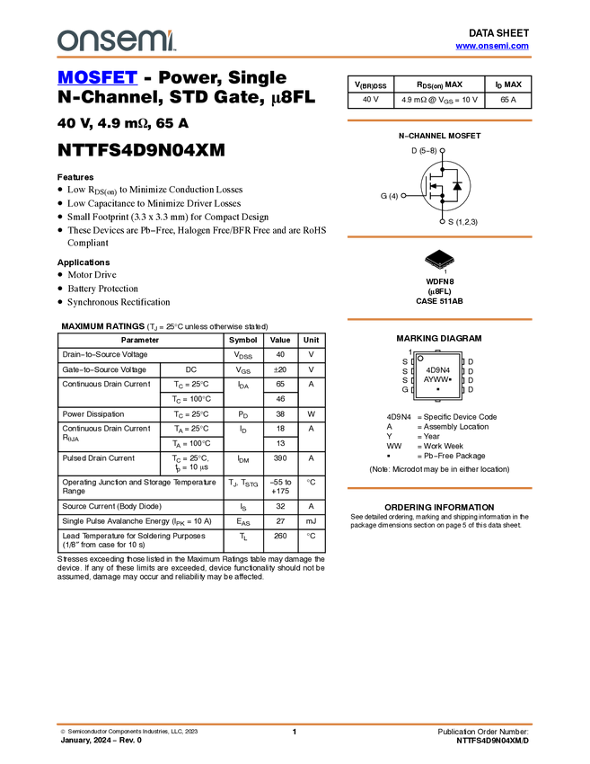 MOSFET - Power, Single N-Channel, STD Gate, Power33 40 V, 4.9 mΩ, 65 A