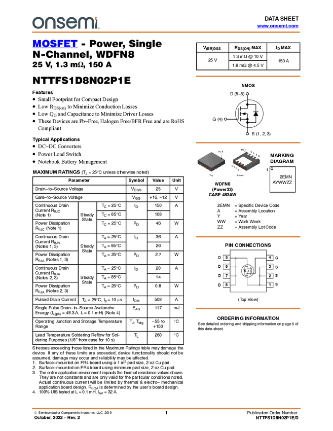 MOSFET - Power, Single N-Channel, Power33, 25V, 1.0mW, 180 A