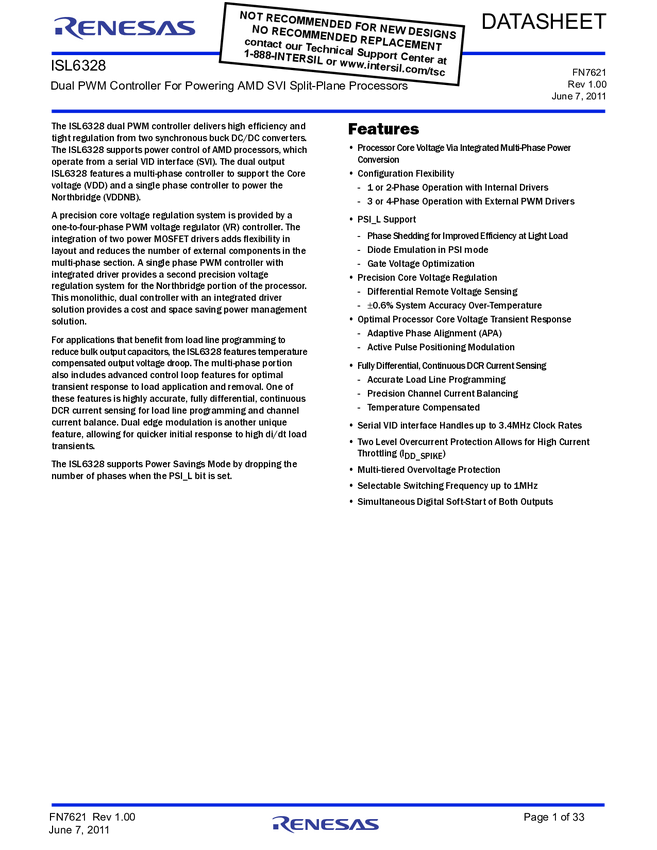 Hybrid SVI/PVI, Monolithic Dual PWM Hybrid Controller Powering AMD SVI Split-Plane and VI Uniplane Processors